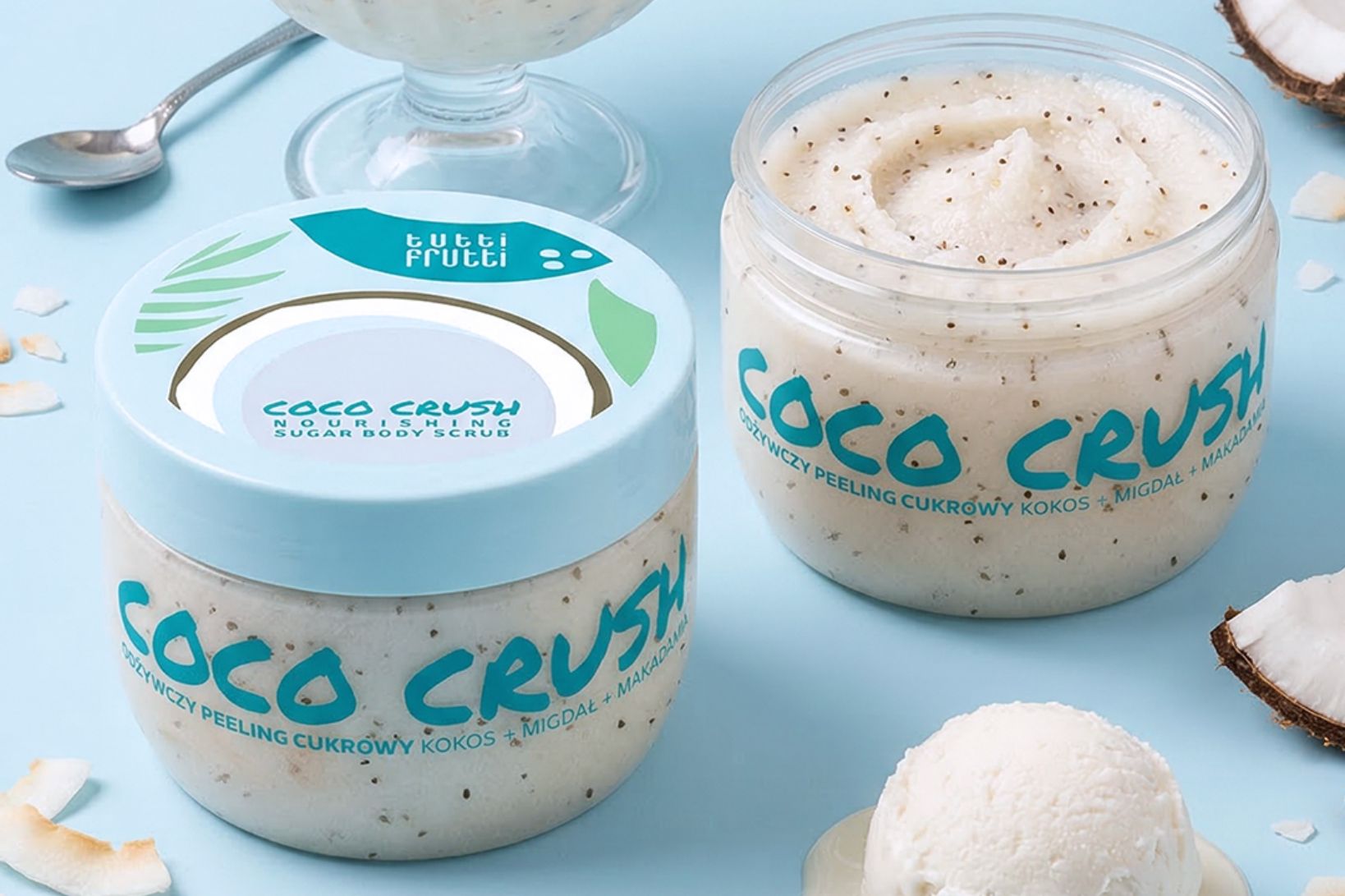 SCRUB. SMOOTH. SHINE! COCO CRUSH to kwintesencja słodkiej pielęgnacji w stylu Tutti Frutti - gęsty, cukrowy peeling, który zamienia codzienny prysznic w prawdziwy Dessert for your skin. Kremowa konsystencja i słodki zapach sprawiają, że każdy moment pielęgnacji to przyjemność, którą chce się powtarzać. To słodki moment tylko dla Ciebie, który sprawia, że skóra wygląda promiennie, gładko i apetycznie, a dotyk staje się prawdziwą przyjemnością. Zanurz się w kokosowej słodyczy i poczuj pielęgnację w stylu Sugar scrub, yummy skin! 300 g